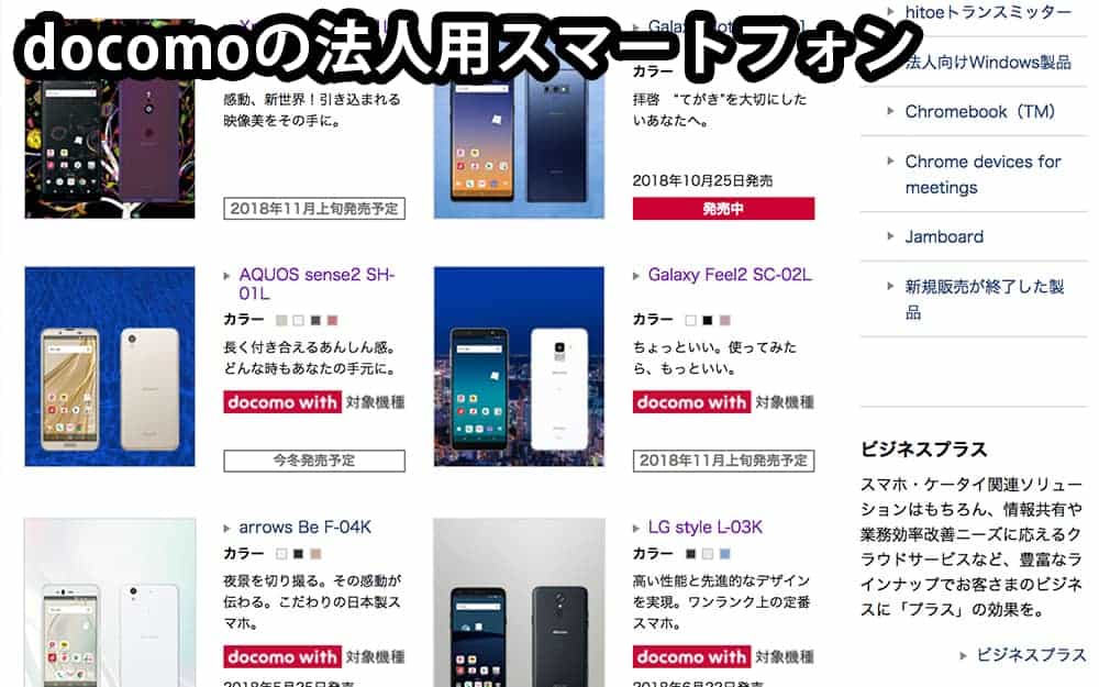 「ビジネスの効率を上げるスマートフォン」と謳われたdocomoのスマートフォンは、豊富なラインアップが用意されています。中でも「docomo with」に選ばれた機種は、機種本体の価格もリーズナブルなため、法人用スマートフォンとしてご利用になられている方も多いようです。