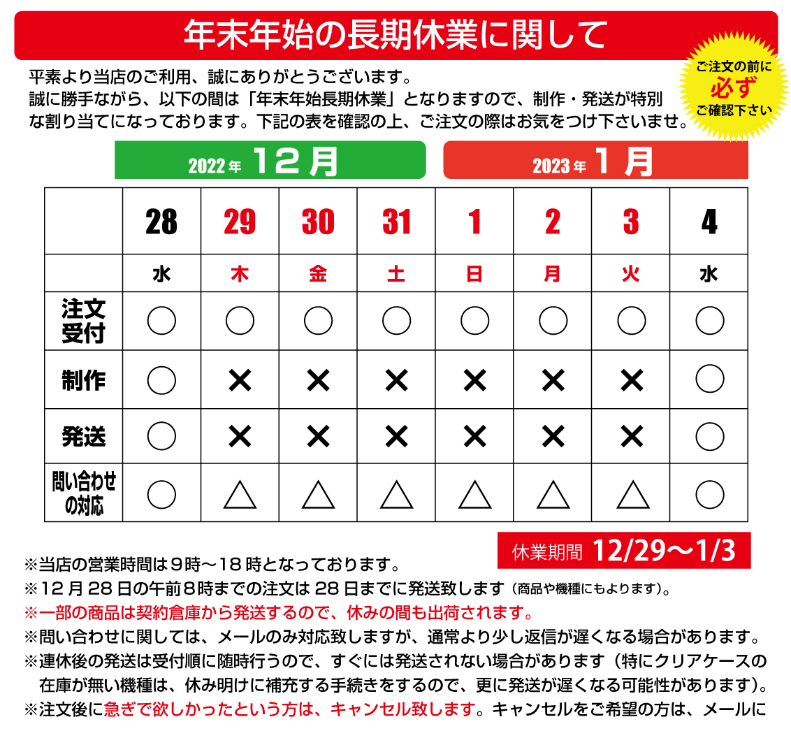 年末年始はは12月29日〜1月3日まで休業とさせていただきます。お問い合わせ頂いても、ご返事が遅れますことをご了承くださいませ。