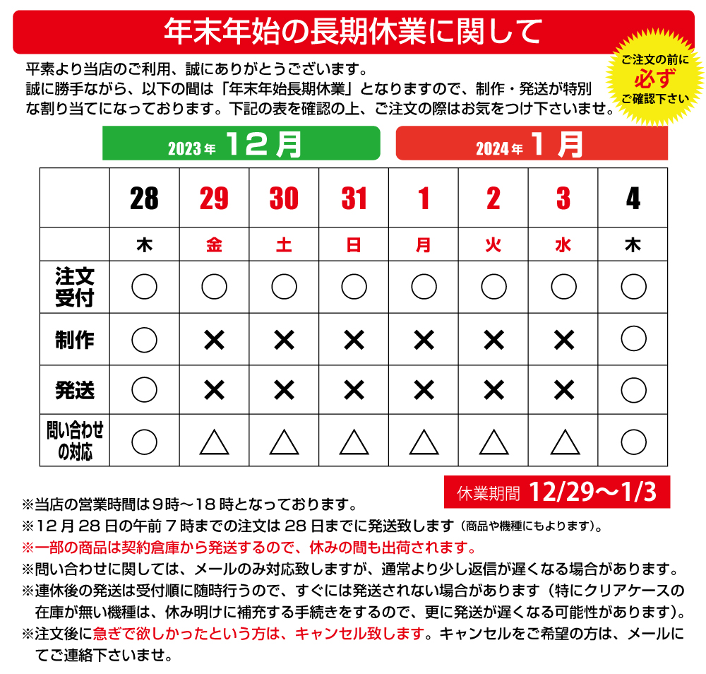 今年も残すところ後わずかになりました。皆様には感謝するとともに、来年も無事にお過ごしされることをスタッフ一同願っております。 さて、年末年始の営業日のお知らせをさせて頂きます。 今年はカレンダーの関係で、お休みが少なく感じます。ご了承のほどよろしくお願いいたします。 また、来年度もご愛用のほどよろしくお願いいたします。