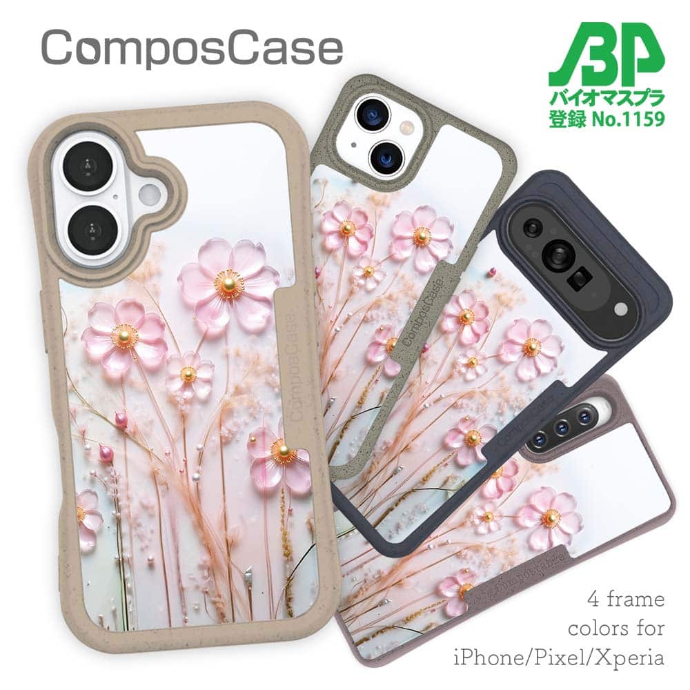 コンポスケースは、環境負荷低減を目的に開発されたスマホケースです。従来のスマホケースと比べCO2排出量を50%削減。しかも、循環型社会に対応した素材を使ったケースです。【コンポスケースの特徴】生分解性プラスチックと再生プラスチック製デザインシートでシーンに合わせて着せ替えグリップしやすいクッション構造本体重量35gと軽い(従来比-30%)衝撃に強いSライン形状究極に押しやすいボタン設計液晶画面、カメラ・レンズを保護生分解性プラスチックだけど割れない 脱着も容易背面は指紋防止加工【本体サイズ】企画:株式会社アングラベース製造;中国素材:生分解性プラスチック(側面)/再生プラスチック(背面)