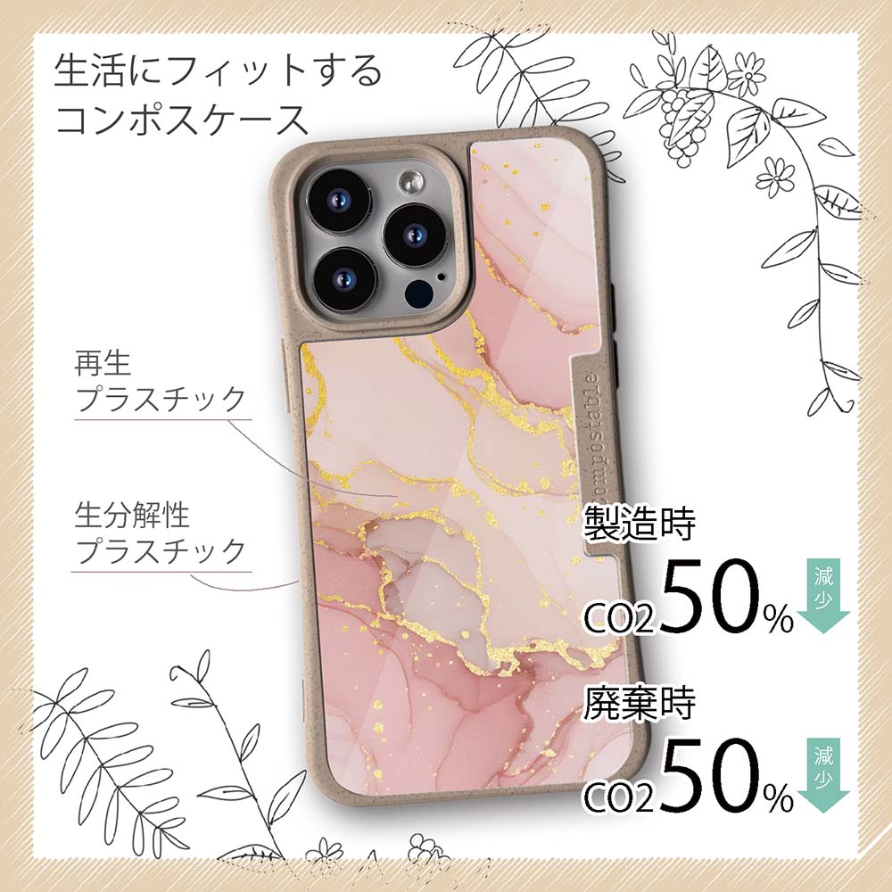 コンポスケースは、環境負荷低減を目的に開発されたスマホケースです。従来のスマホケースと比べCO2排出量を50%削減。しかも、循環型社会に対応した素材を使ったケースです。【コンポスケースの特徴】生分解性プラスチックと再生プラスチック製デザインシートでシーンに合わせて着せ替えグリップしやすいクッション構造