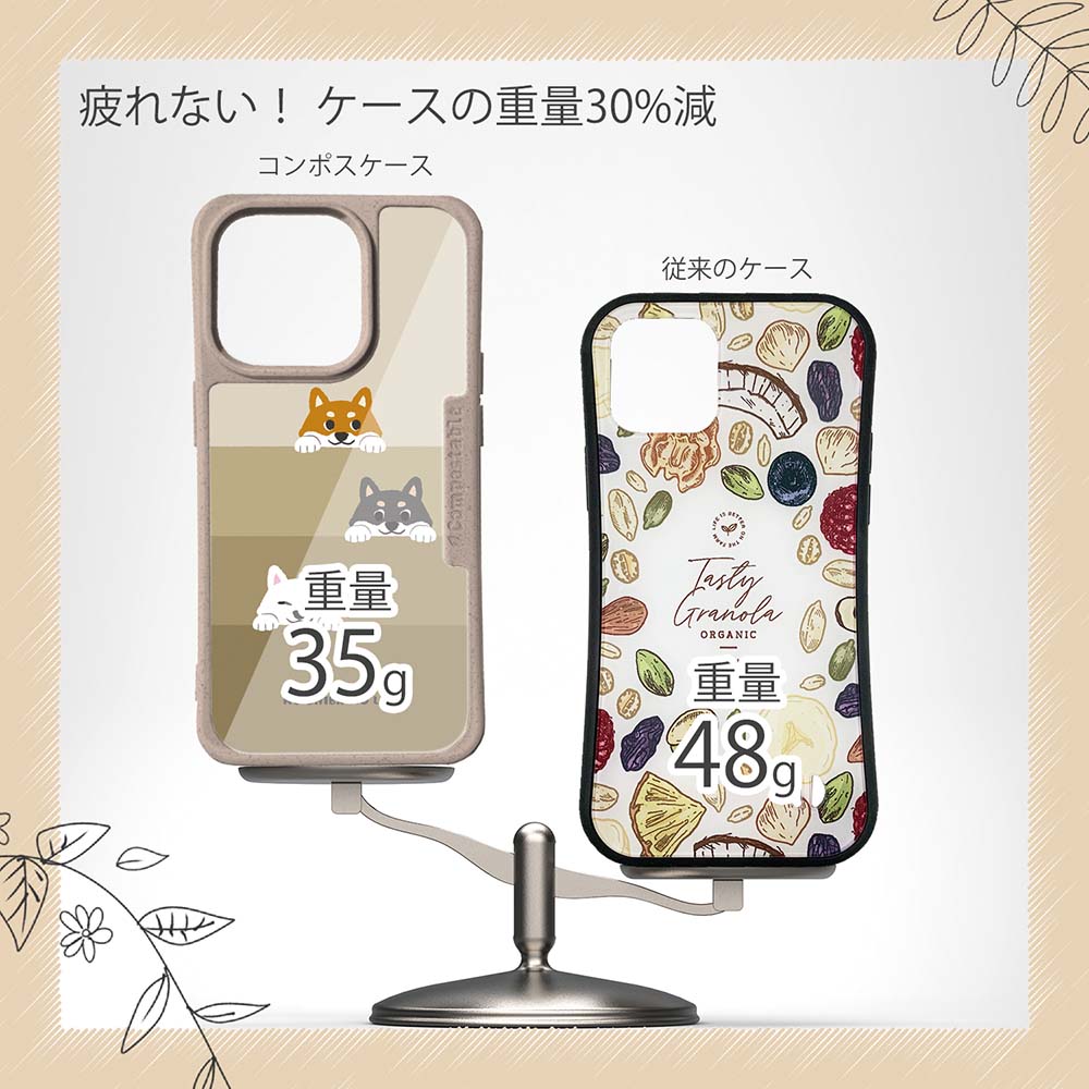 【コンポスケースの特徴】生分解性プラスチックと再生プラスチック製デザインシートでシーンに合わせて着せ替えグリップしやすいクッション構造本体重量35gと軽い(従来比-30%)衝撃に強いSライン形状究極に押しやすいボタン設計液晶画面、カメラ・レンズを保護生分解性プラスチックだけど割れない 脱着も容易背面は指紋防止加工【本体サイズ】