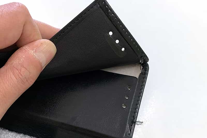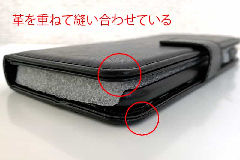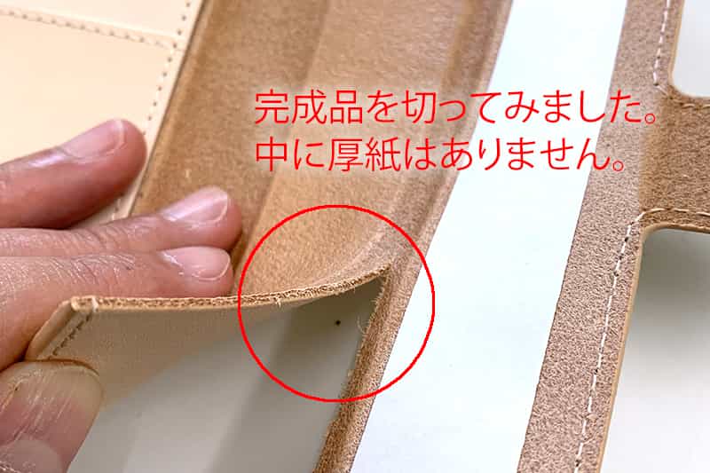 まず、一般的な本革ケースとは、表側(または表と内側)に本革を仕様し、内側にクッション材として厚紙などを入れて縫い合わせています。