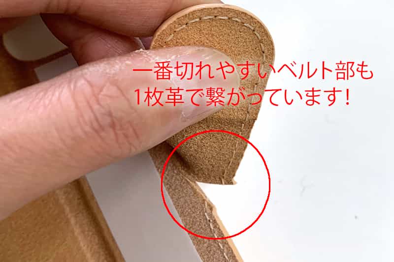 ベルト部まで1枚につながった本革を使用しているケースはなかなかありません。ベルト部を含めた形で切り取ると、その分余分なあまりが出てしまうため、革がもったいないからです。