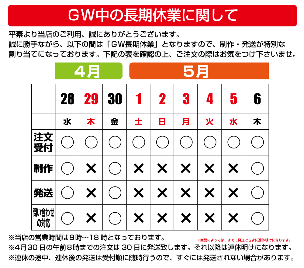 2021年のGWは、カレンダー通り4月29日、5月1〜5日が休日となります。 6日より通常営業となりますが、その間発送やメールでのお問い合わせを承ることができません。 予め、ご了承のほどよろしくお願いいたします! 6日以降、順次ご対応させていただきます。