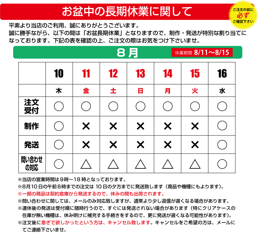 ご注文頂いた商品のキャンセルは、翌日の午前10時までは承っております。機種の間違いやデザインの変更なども同時刻まで承ります。