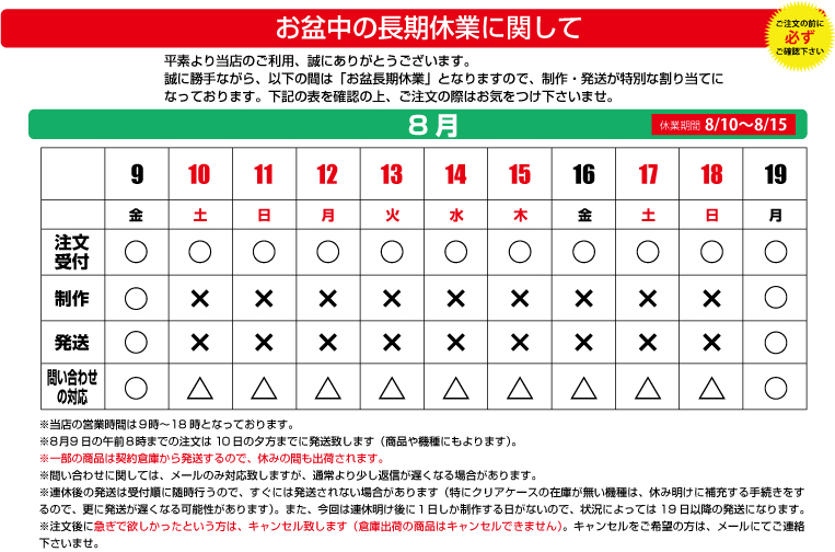 ご注文頂いた商品のキャンセルは、翌日の午前10時までは承っております。機種の間違いやデザインの変更なども同時刻まで承ります。