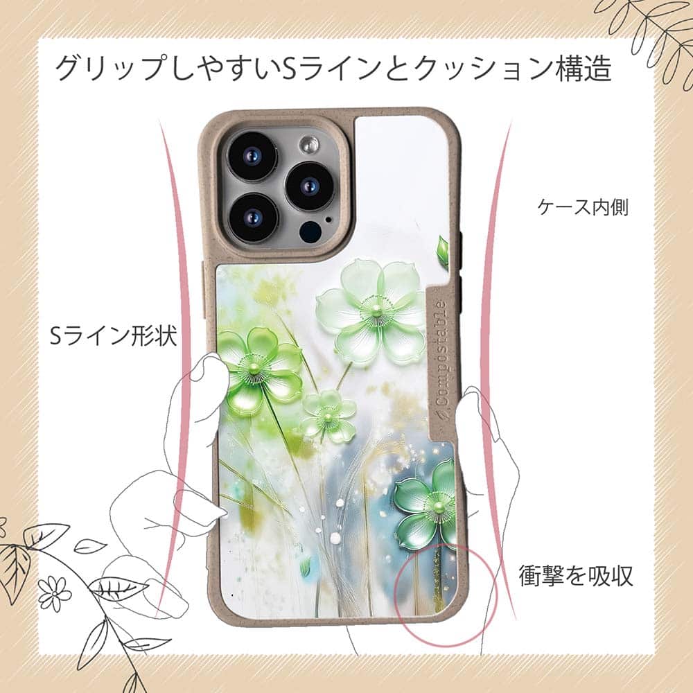 コンポスケースは、環境負荷低減を目的に開発されたスマホケースです。従来のスマホケースと比べCO2排出量を50%削減。しかも、循環型社会に対応した素材を使ったケースです。【コンポスケースの特徴】生分解性プラスチックと再生プラスチック製デザインシートでシーンに合わせて着せ替えグリップしやすいクッション構造本体重量35gと軽い(従来比-30%)衝撃に強いSライン形状究極に押しやすいボタン設計液晶画面、カメラ・レンズを保護生分解性プラスチックだけど割れない 脱着も容易背面は指紋防止加工【本体サイズ】企画:株式会社アングラベース製造;中国素材:生分解性プラスチック(側面)/再生プラスチック(背面)