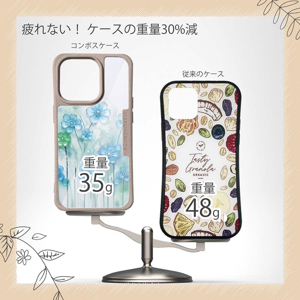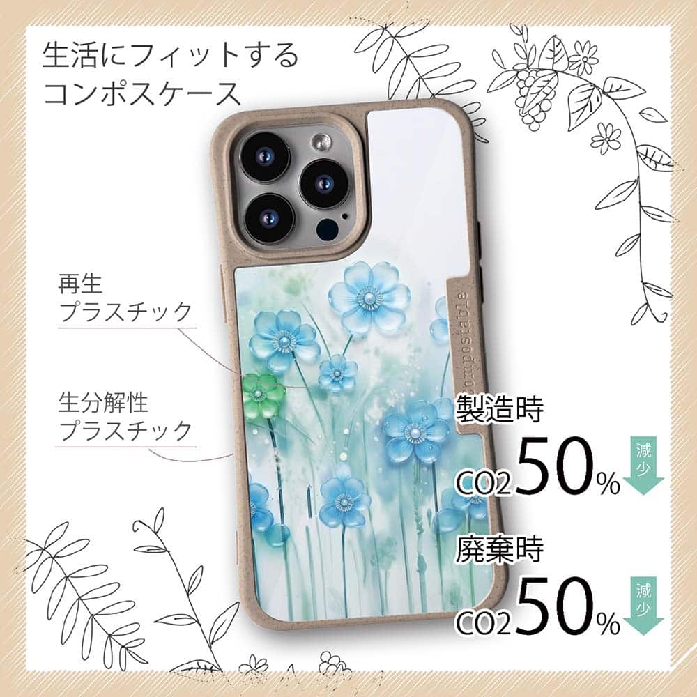 コンポスケースは、環境負荷低減を目的に開発されたスマホケースです。従来のスマホケースと比べCO2排出量を50%削減。しかも、循環型社会に対応した素材を使ったケースです。【コンポスケースの特徴】生分解性プラスチックと再生プラスチック製デザインシートでシーンに合わせて着せ替えグリップしやすいクッション構造本体重量35gと軽い(従来比-30%)衝撃に強いSライン形状究極に押しやすいボタン設計液晶画面、カメラ・レンズを保護生分解性プラスチックだけど割れない 脱着も容易背面は指紋防止加工【本体サイズ】企画:株式会社アングラベース製造;中国素材:生分解性プラスチック(側面)/再生プラスチック(背面)