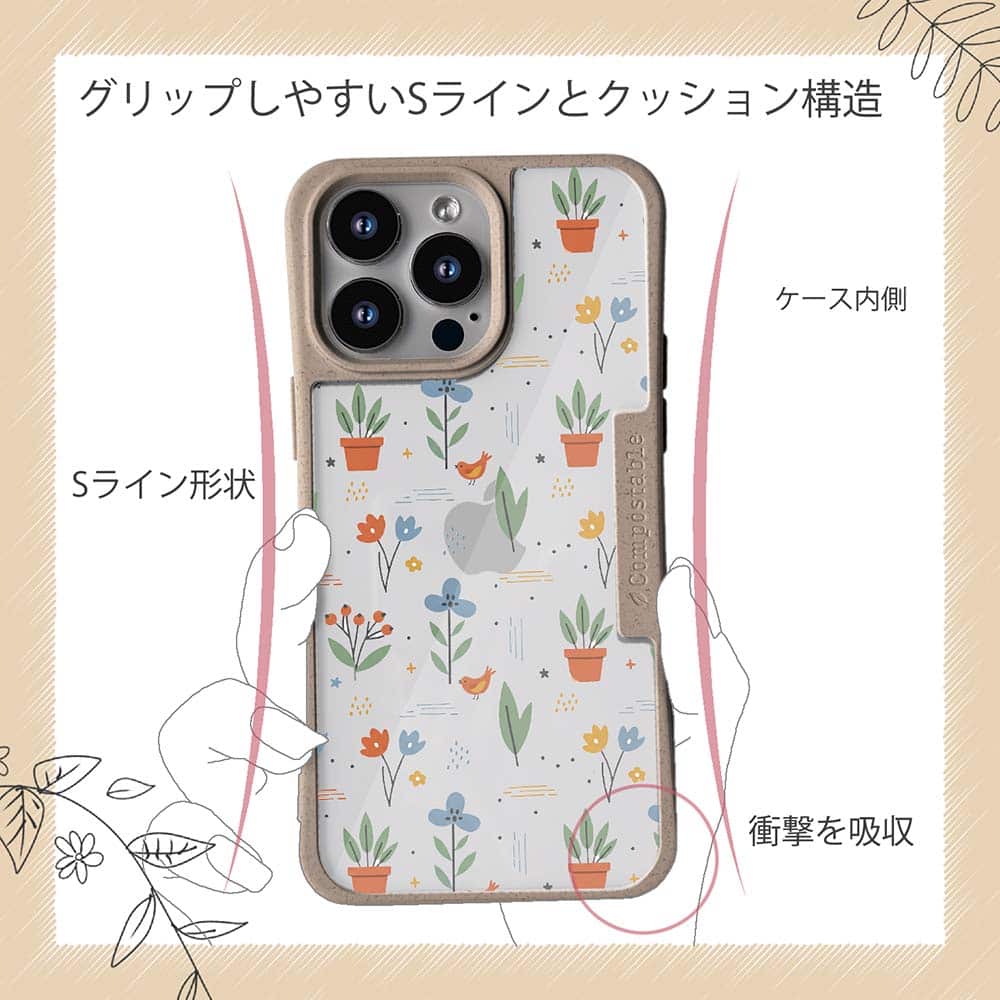 コンポスケースは、環境負荷低減を目的に開発されたスマホケースです。従来のスマホケースと比べCO2排出量を50%削減。しかも、循環型社会に対応した素材を使ったケースです。【コンポスケースの特徴】生分解性プラスチックと再生プラスチック製デザインシートでシーンに合わせて着せ替えグリップしやすいクッション構造本体重量35gと軽い(従来比-30%)衝撃に強いSライン形状究極に押しやすいボタン設計液晶画面、カメラ・レンズを保護生分解性プラスチックだけど割れない 脱着も容易背面は指紋防止加工【本体サイズ】企画:株式会社アングラベース製造;中国素材:生分解性プラスチック(側面)/再生プラスチック(背面)