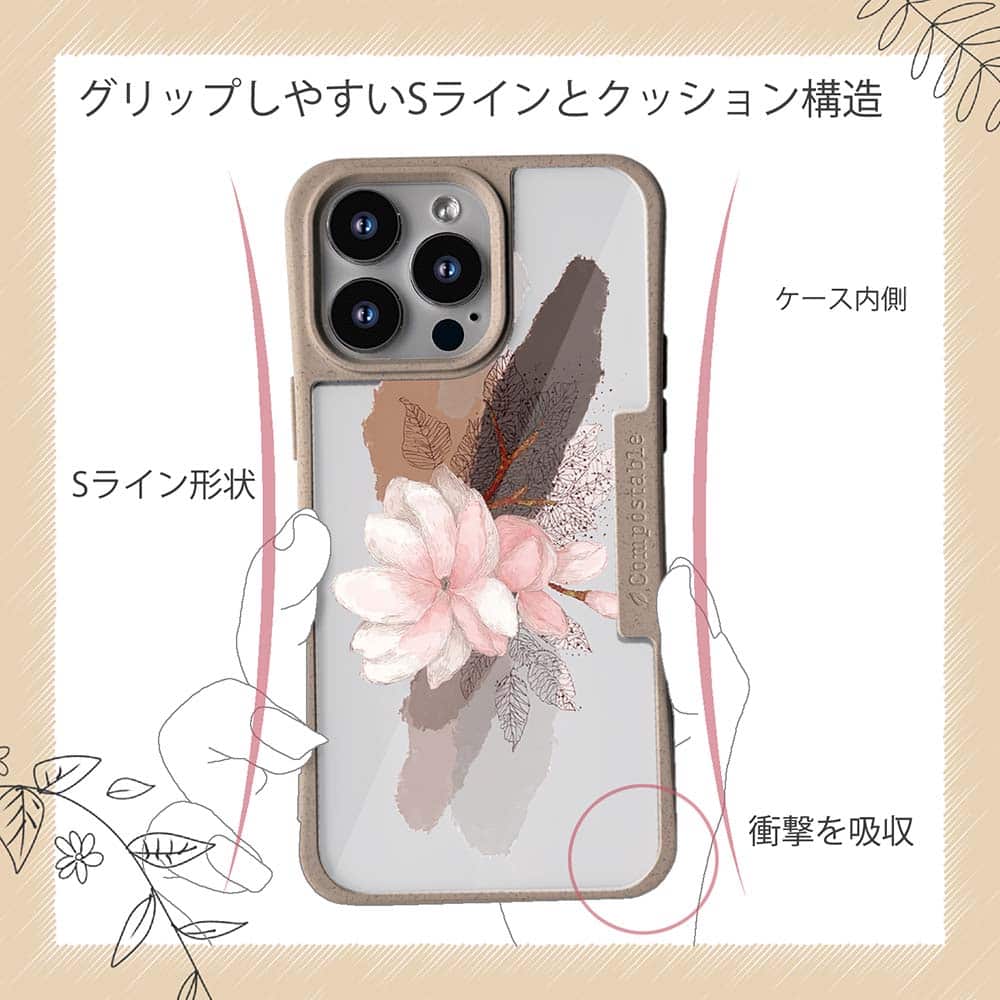 コンポスケースは、環境負荷低減を目的に開発されたスマホケースです。従来のスマホケースと比べCO2排出量を50%削減。しかも、循環型社会に対応した素材を使ったケースです。【コンポスケースの特徴】生分解性プラスチックと再生プラスチック製デザインシートでシーンに合わせて着せ替えグリップしやすいクッション構造本体重量35gと軽い(従来比-30%)衝撃に強いSライン形状究極に押しやすいボタン設計液晶画面、カメラ・レンズを保護生分解性プラスチックだけど割れない 脱着も容易背面は指紋防止加工【本体サイズ】企画:株式会社アングラベース製造;中国素材:生分解性プラスチック(側面)/再生プラスチック(背面)