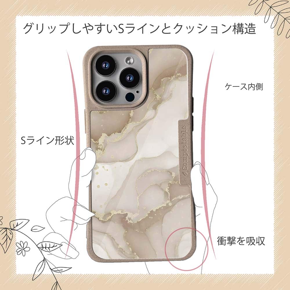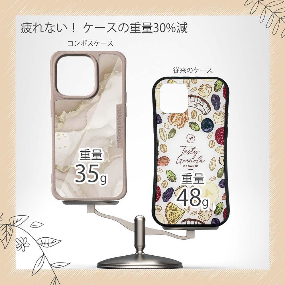 コンポスケースは、環境負荷低減を目的に開発されたスマホケースです。従来のスマホケースと比べCO2排出量を50%削減。しかも、循環型社会に対応した素材を使ったケースです。【コンポスケースの特徴】生分解性プラスチックと再生プラスチック製デザインシートでシーンに合わせて着せ替えグリップしやすいクッション構造