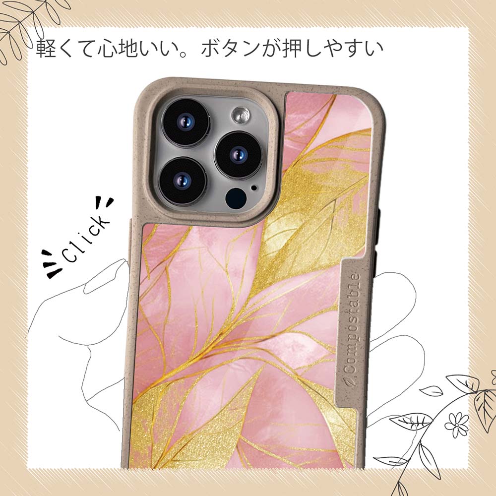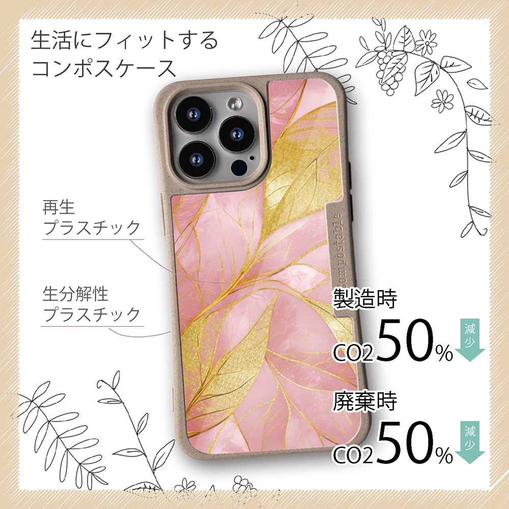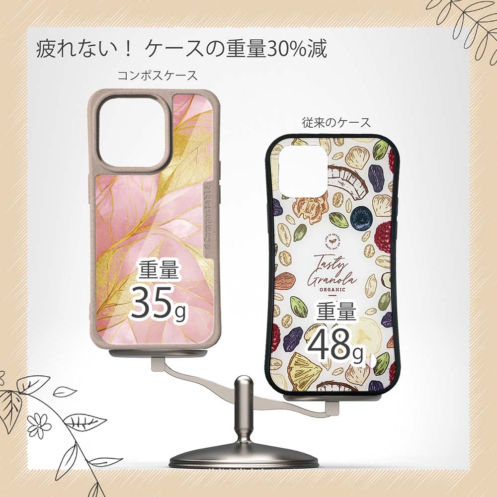 コンポスケースは、環境負荷低減を目的に開発されたスマホケースです。従来のスマホケースと比べCO2排出量を50%削減。しかも、循環型社会に対応した素材を使ったケースです。【コンポスケースの特徴】生分解性プラスチックと再生プラスチック製デザインシートでシーンに合わせて着せ替えグリップしやすいクッション構造本体重量35gと軽い(従来比-30%)衝撃に強いSライン形状