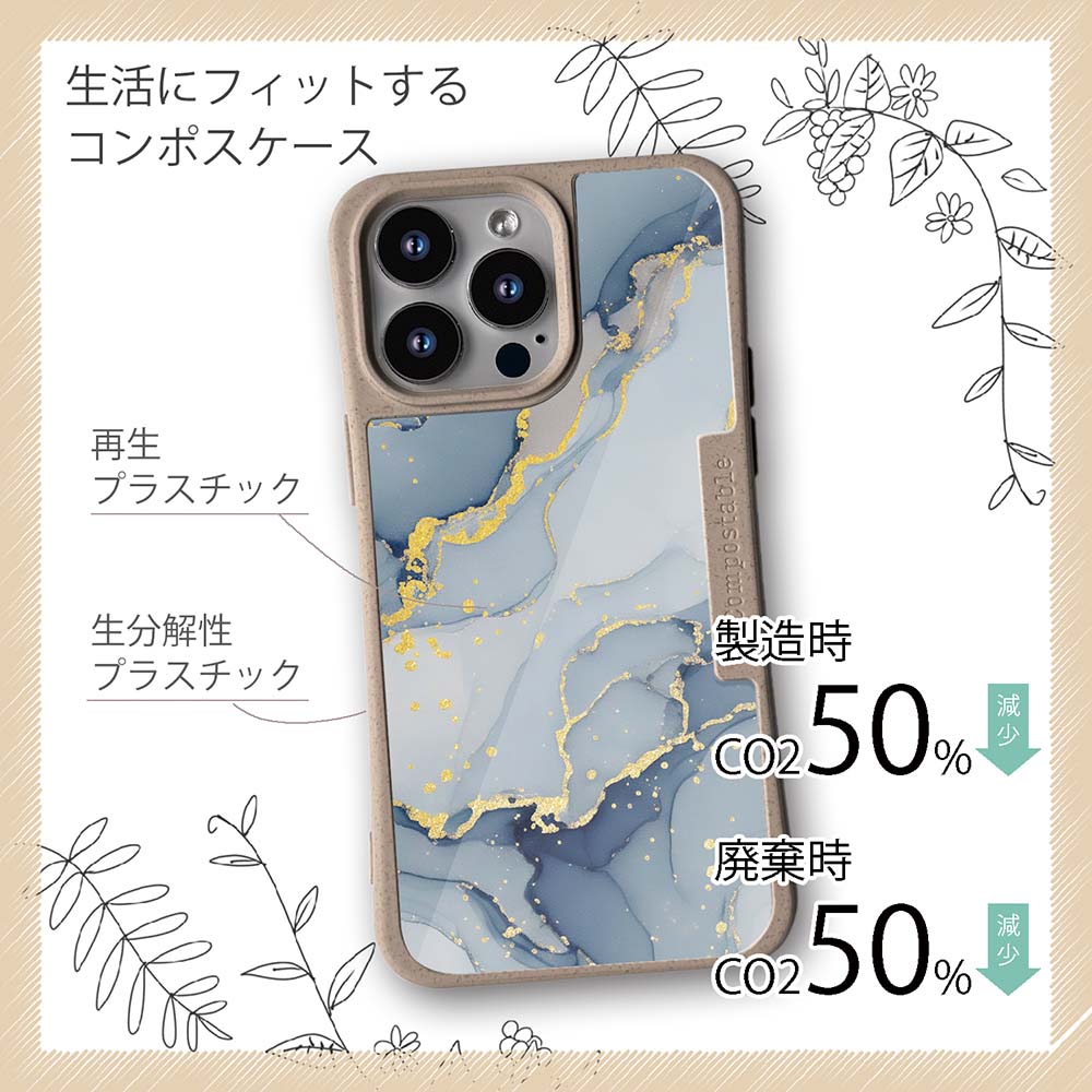 コンポスケースは、環境負荷低減を目的に開発されたスマホケースです。従来のスマホケースと比べCO2排出量を50%削減。しかも、循環型社会に対応した素材を使ったケースです。【コンポスケースの特徴】生分解性プラスチックと再生プラスチック製デザインシートでシーンに合わせて着せ替えグリップしやすいクッション構造