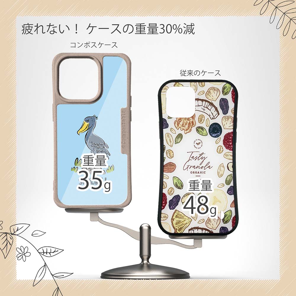 【コンポスケースの特徴】生分解性プラスチックと再生プラスチック製デザインシートでシーンに合わせて着せ替えグリップしやすいクッション構造本体重量35gと軽い(従来比-30%)衝撃に強いSライン形状究極に押しやすいボタン設計液晶画面、カメラ・レンズを保護生分解性プラスチックだけど割れない 脱着も容易背面は指紋防止加工