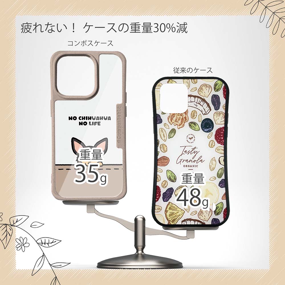 【コンポスケースの特徴】生分解性プラスチックと再生プラスチック製デザインシートでシーンに合わせて着せ替えグリップしやすいクッション構造本体重量35gと軽い(従来比-30%)衝撃に強いSライン形状究極に押しやすいボタン設計液晶画面、カメラ・レンズを保護生分解性プラスチックだけど割れない 脱着も容易背面は指紋防止加工【本体サイズ】企画:株式会社アングラベース製造;中国