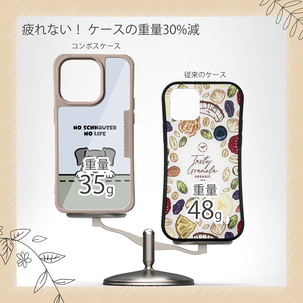 【コンポスケースの特徴】生分解性プラスチックと再生プラスチック製デザインシートでシーンに合わせて着せ替えグリップしやすいクッション構造本体重量35gと軽い(従来比-30%)衝撃に強いSライン形状究極に押しやすいボタン設計液晶画面、カメラ・レンズを保護生分解性プラスチックだけど割れない 脱着も容易背面は指紋防止加工【本体サイズ】企画:株式会社アングラベース製造;中国素材:生分解性プラスチック(側面)/再生プラスチック(背面)