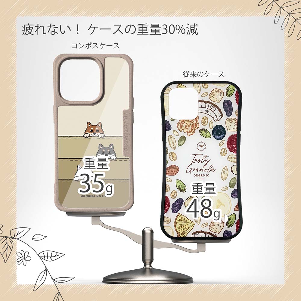 【コンポスケースの特徴】生分解性プラスチックと再生プラスチック製デザインシートでシーンに合わせて着せ替えグリップしやすいクッション構造本体重量35gと軽い(従来比-30%)衝撃に強いSライン形状究極に押しやすいボタン設計液晶画面、カメラ・レンズを保護生分解性プラスチックだけど割れない 脱着も容易背面は指紋防止加工【本体サイズ】企画:株式会社アングラベース製造;中国素材:生分解性プラスチック(側面)/再生プラスチック(背面)